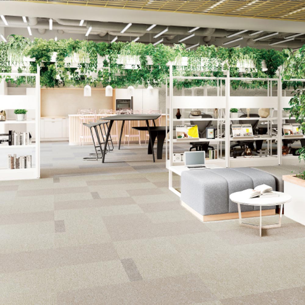 通行量の多い場所に適している「重歩行」に対応した土足OKのタイルカーペット。