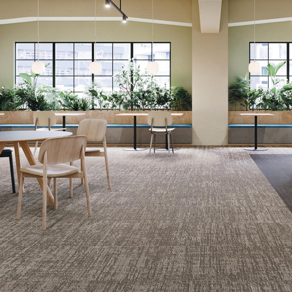 通行量の多い場所に適している「重歩行」に対応した土足OKのタイルカーペット。