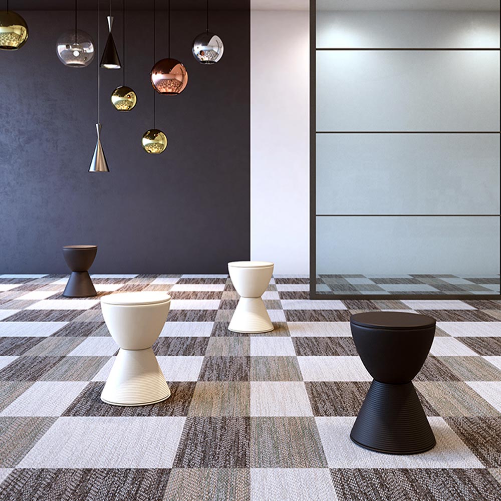 通行量の多い場所に適している「重歩行」に対応した土足OKのタイルカーペット。