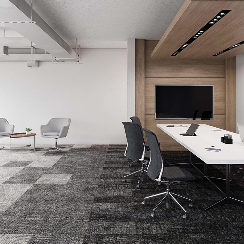 通行量の多い場所に適している「重歩行」に対応した土足OKのタイルカーペット。