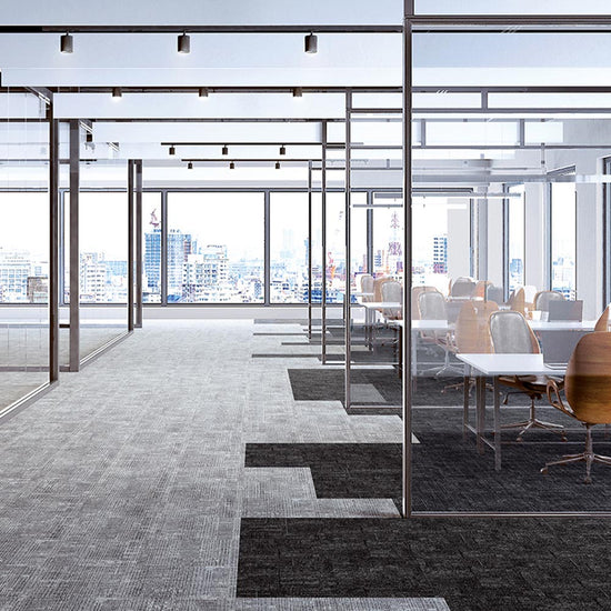 通行量の多い場所に適している「重歩行」に対応した土足OKのタイルカーペット。