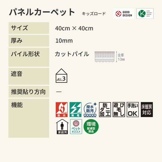 | 機能 | F☆☆☆☆ 防炎 制電 防ダニ 床暖房対応 遮音(ΔLL-3) 遊び毛なし 手洗いOK 家庭用 ペットおすすめ 環境配慮型商品 機能について詳しく見る >> |