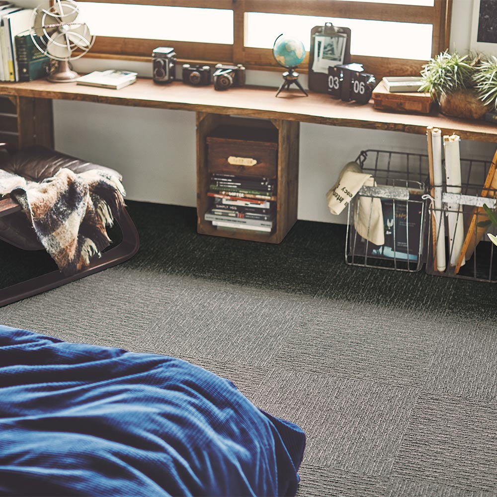 フローリングなどの上に置くだけでずれない、吸着タイプのタイルカーペット。