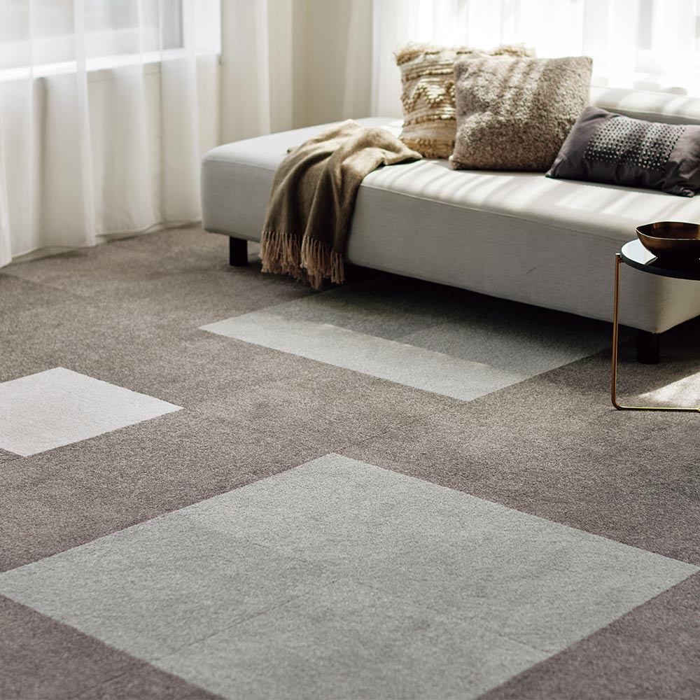 フローリングなどの上に置くだけでずれない、吸着タイプのタイルカーペット。