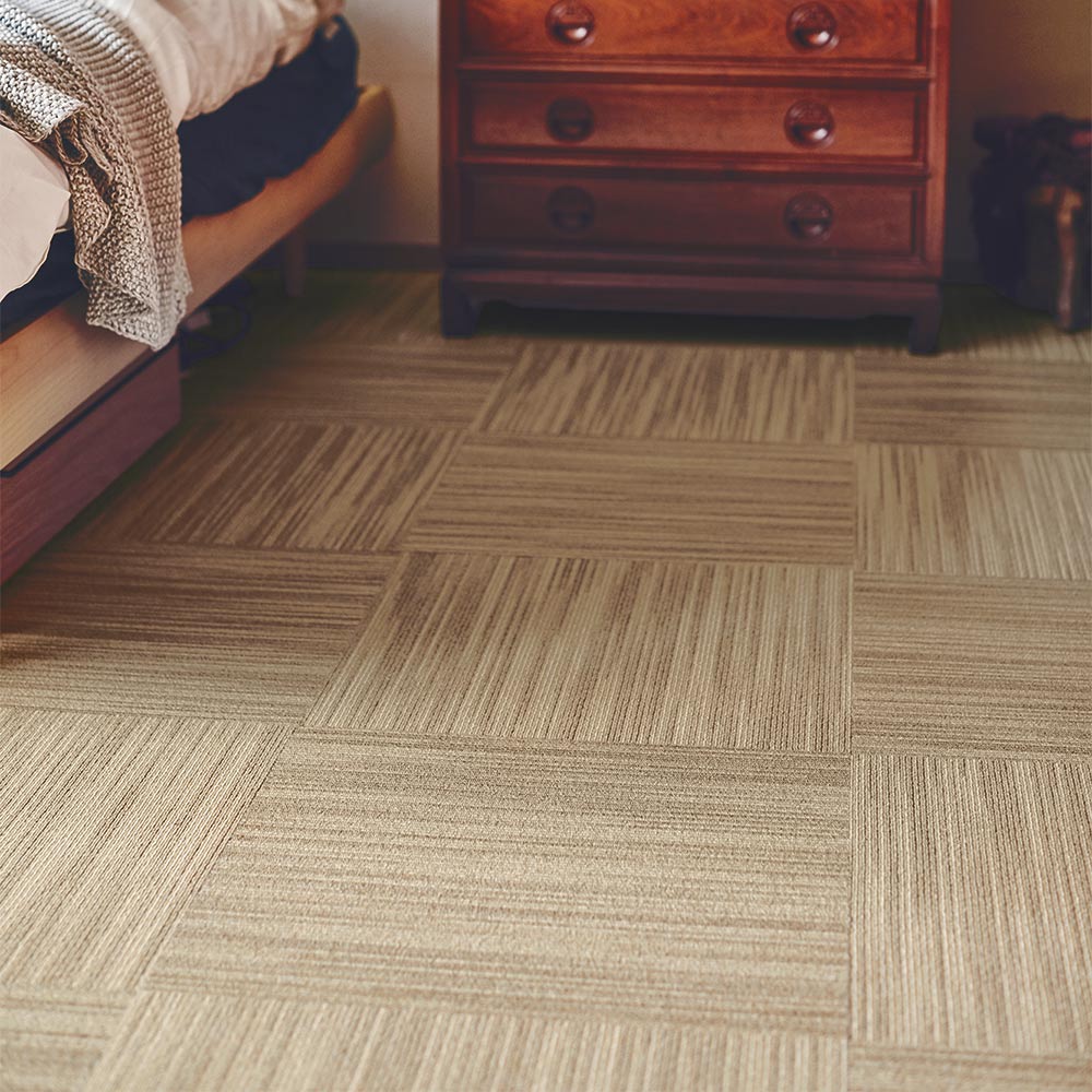 フローリングなどの上に置くだけでずれない、吸着タイプのタイルカーペット。