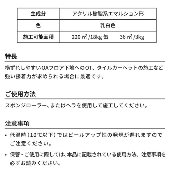 | 用途 | タイルカーペット、フロアタイルOT、ピールアップ形接着剤 |