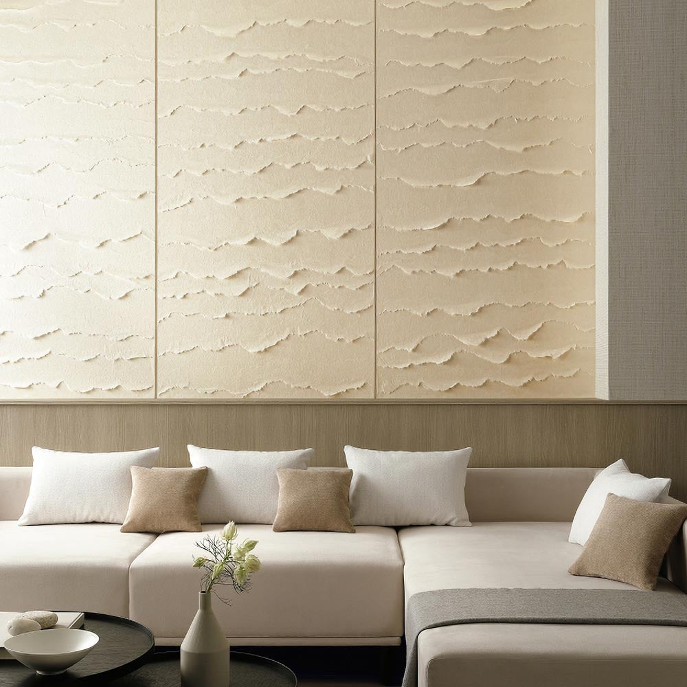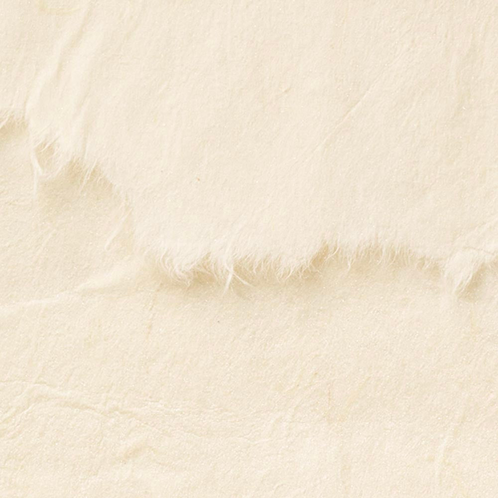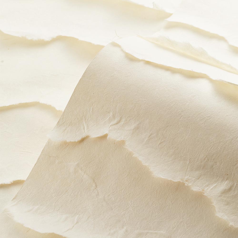 ベースの紙の上に帯状に手で裂いた和紙を貼り重ね、下側だけが浮く形のデザインです。