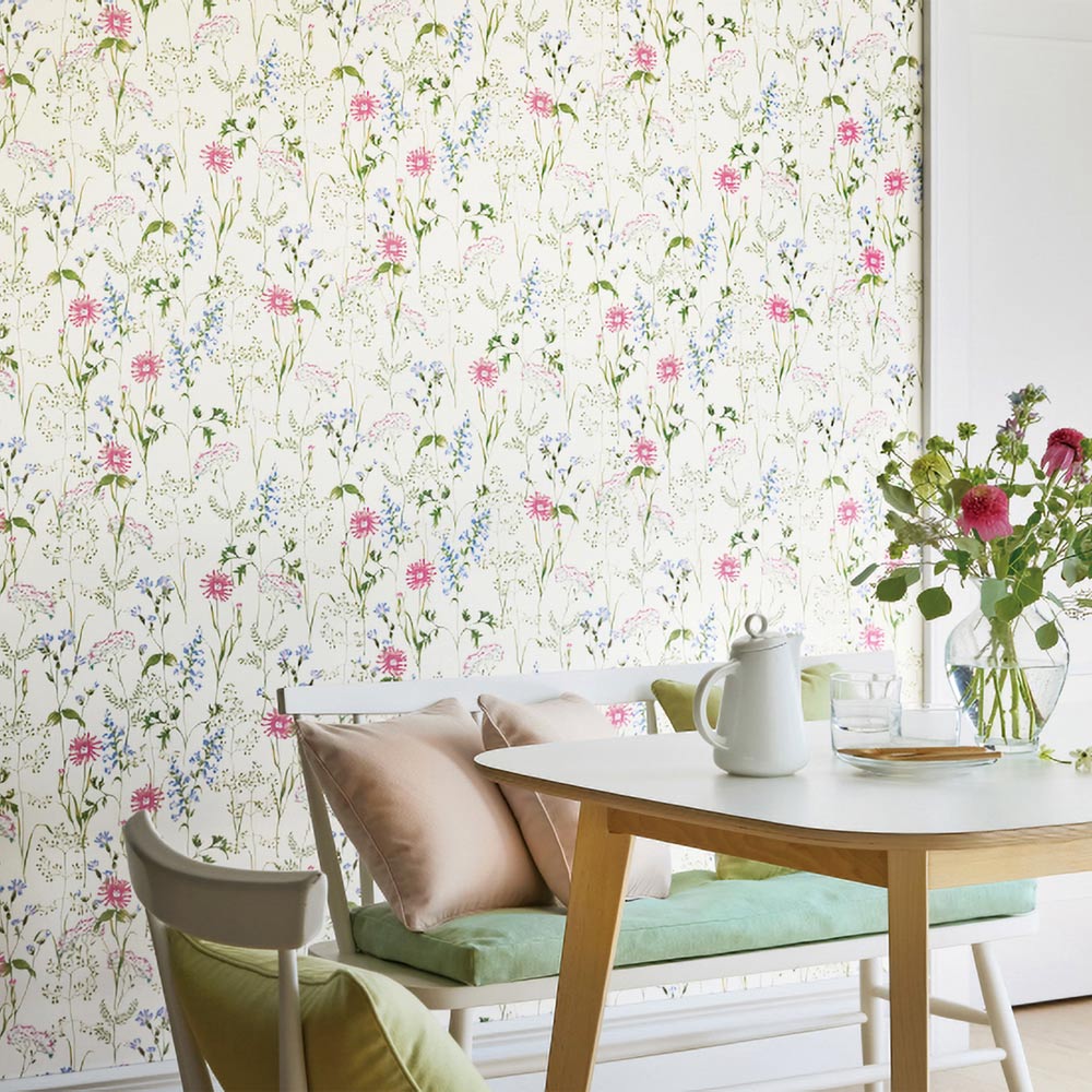 複雑に印刷版を重ねて作られたフラワー柄のビニル壁紙です。
