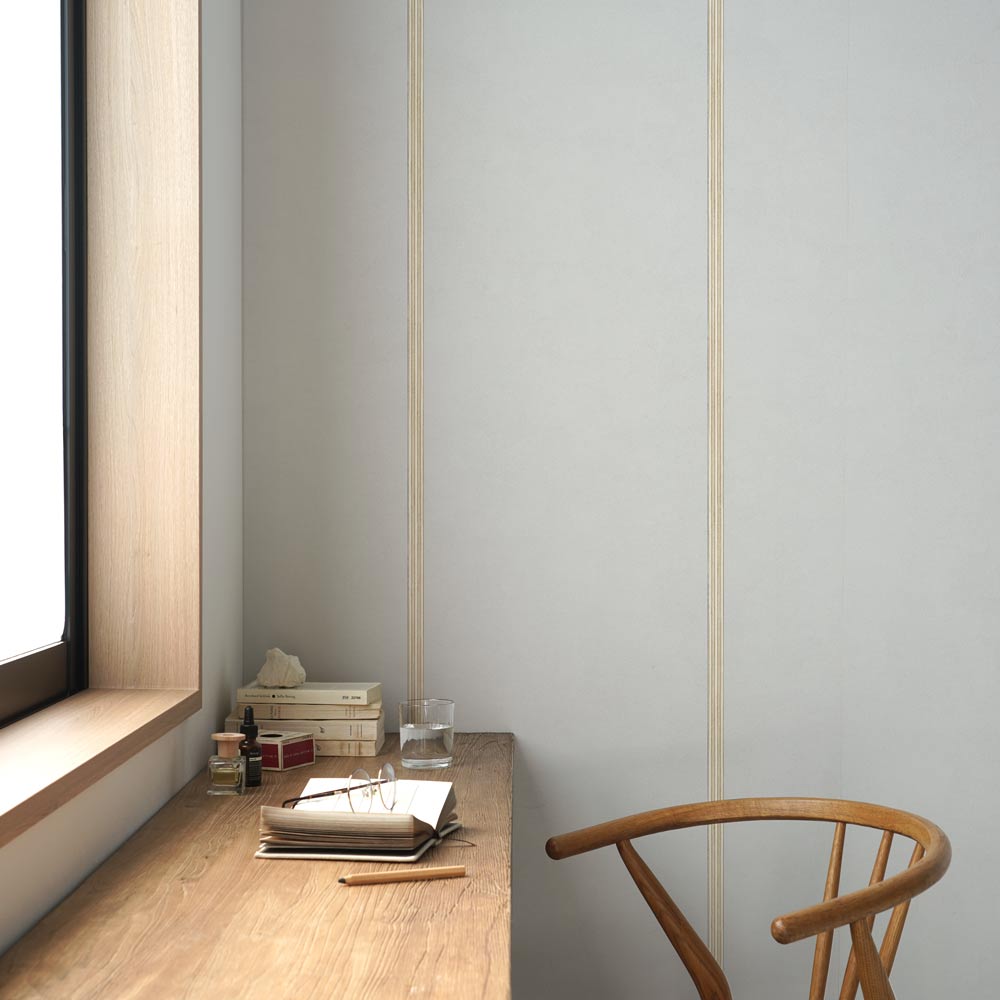 木目や木製が多いナチュラルインテリアにも合わせやすく、ストライプのように入る合板の縦縞がアクセントになる壁紙です。