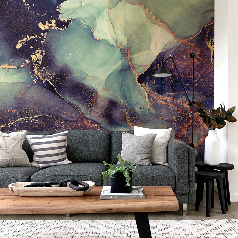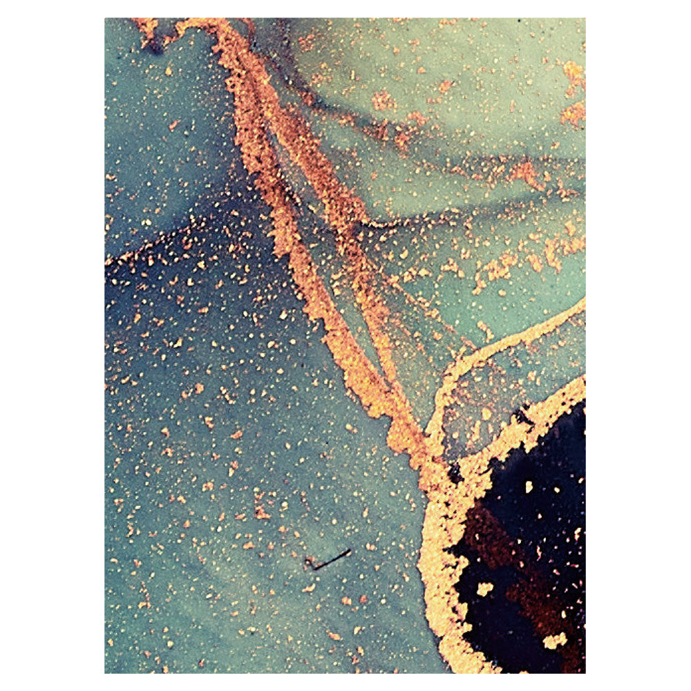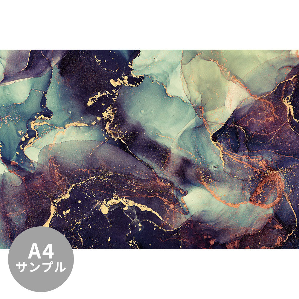 紫と緑、ゴールドが混ざり合う夜空のようなアルコールインクアート。