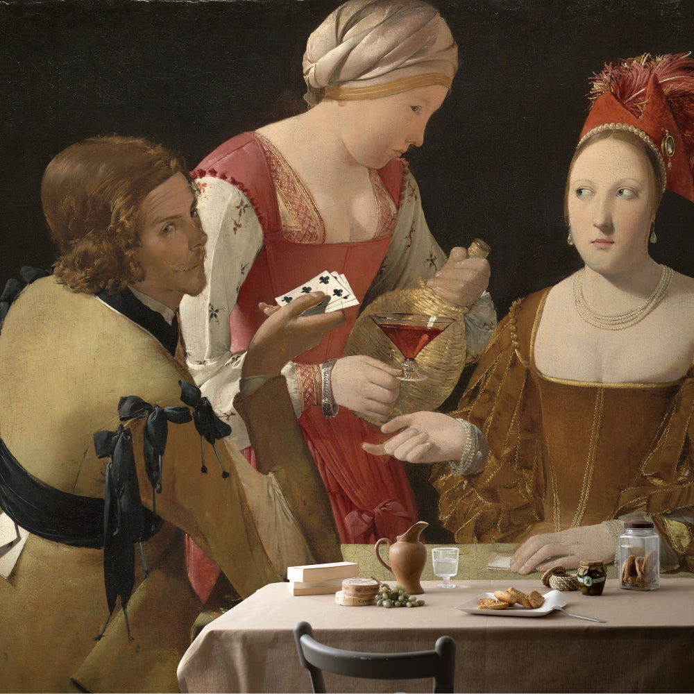 それぞれの人物の視線が巧みに描かれた作品。まったく同じ人物と構図で描かれた「ダイヤのエースを持ついかさま師」もある。
