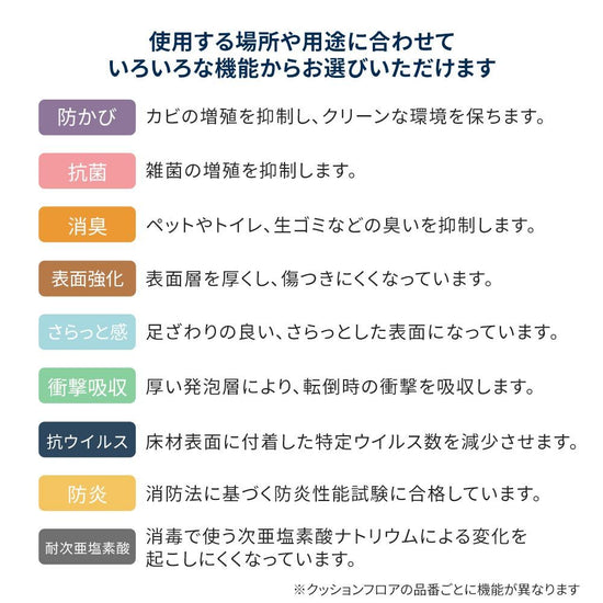 | 機能 | 抗菌 防カビ 防炎 さらっと感 衝撃吸収 ペットオススメ NO WAX 消臭 機能について詳しく見る >> |