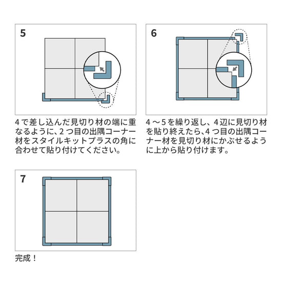 タイルカーペットを部分敷きした際、「見切り材」と「コーナー材」を外周部に貼り付けることで、端部のほつれやダメージを防いだり、フローリング面との段差をなだらかにしたりできます。
